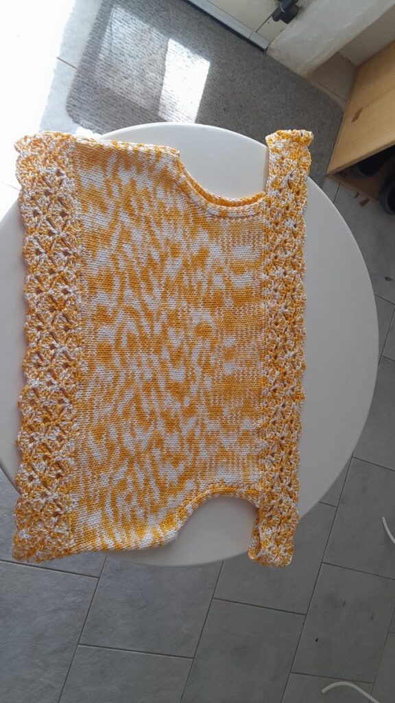 Stupendo, a ferri e uncinetto. Tiene bene i colori e la forma. Adoro. Usato per un top madre figlia (con borsina portagettoni per la sala giochi) , molto soddisfatte